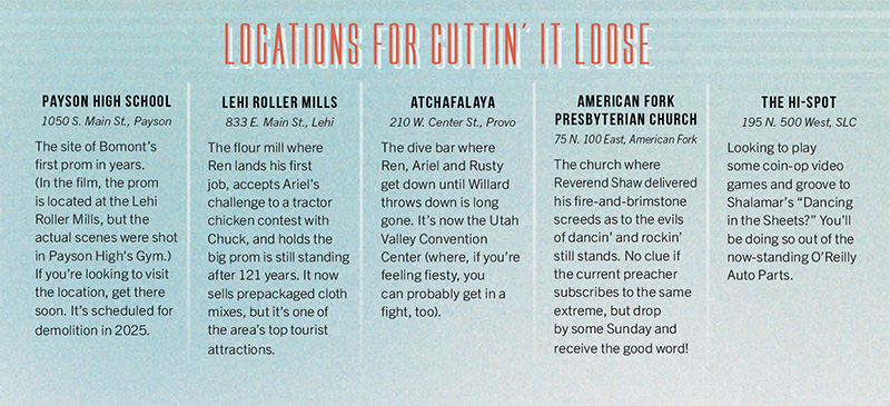 The upside of the film’s low-star power casting? No paparazzi were going to schlep out to Utah County for Kevin Bacon in 1983. The Footloose production team found unconventional locations like the Lehi Roller Mill, The Hi-Spot hangout (where Ariel gets busted by John Lithgow’s Shaw for gyrating to Shalamar’s “Dancing in the Sheets”) and, most notably, Payson High School. Thus, Payson became forever synonymous with the fictional Midwestern town of Bomont, the dance-banning town in the film. (Note: Kids then and now can actually dance in Payson.)
