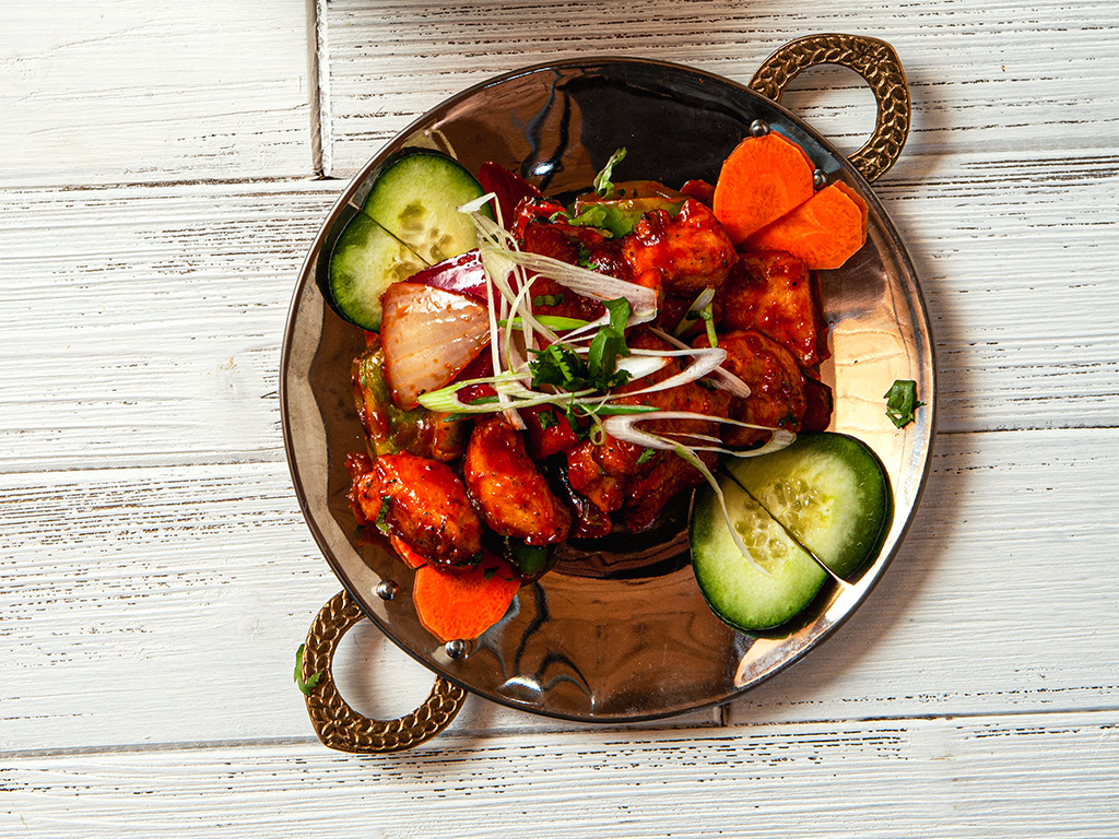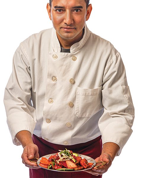 Chef Bikash Adhikari with a Nepali-style spicy stir fry. Photo by Adam Finkle