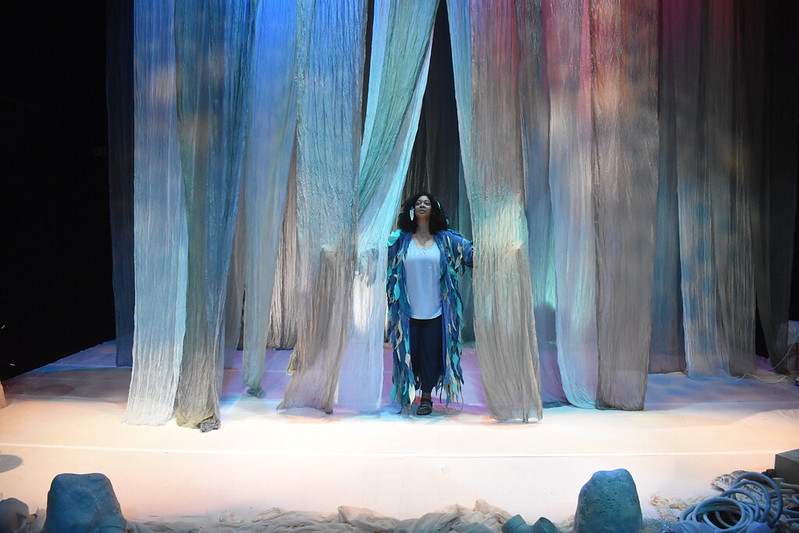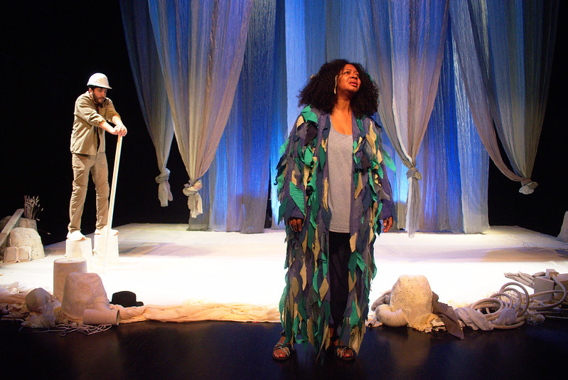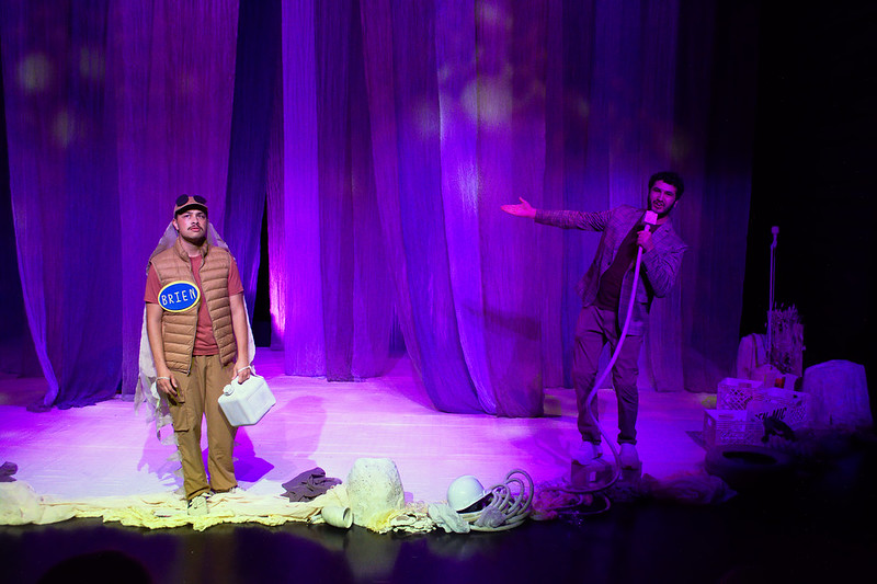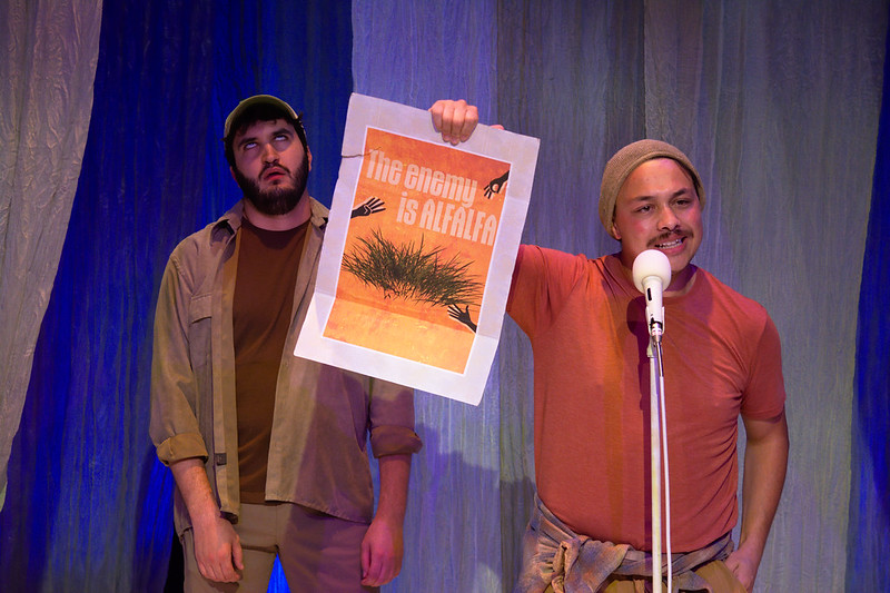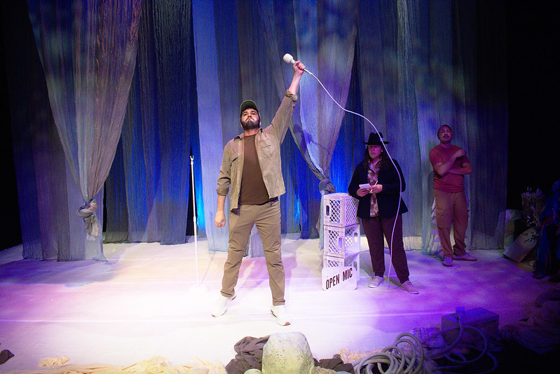 In the spirit of grassroots theatre, the set design is simple, functional and evocative. Sheer blue fabric drapes from the ceiling, adding both vertical appeal and visions of moving water. Framing the open stage is a collection of pale plastic items one would likely find along the shores of any body of water, and they come in handy when a cast member needs to host an impromptu game show or operate an imagined bulldozer. The costume design is similarly simplified, blending classic Utah attire like puffy jackets and Chacos with organic shapes and materials.