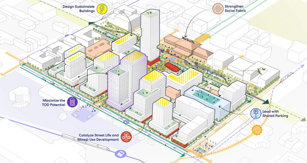 “Designed as a low-carbon community, it leverages its proximity to a variety of transportation choices and provides a healthy walkable environment,” says Geeti Silwal, Principal and Urban Design Practice Leader for Perkins & Will. They plan for the re-development area to serve as a bridge between Downtown and neighborhoods west of downtown.