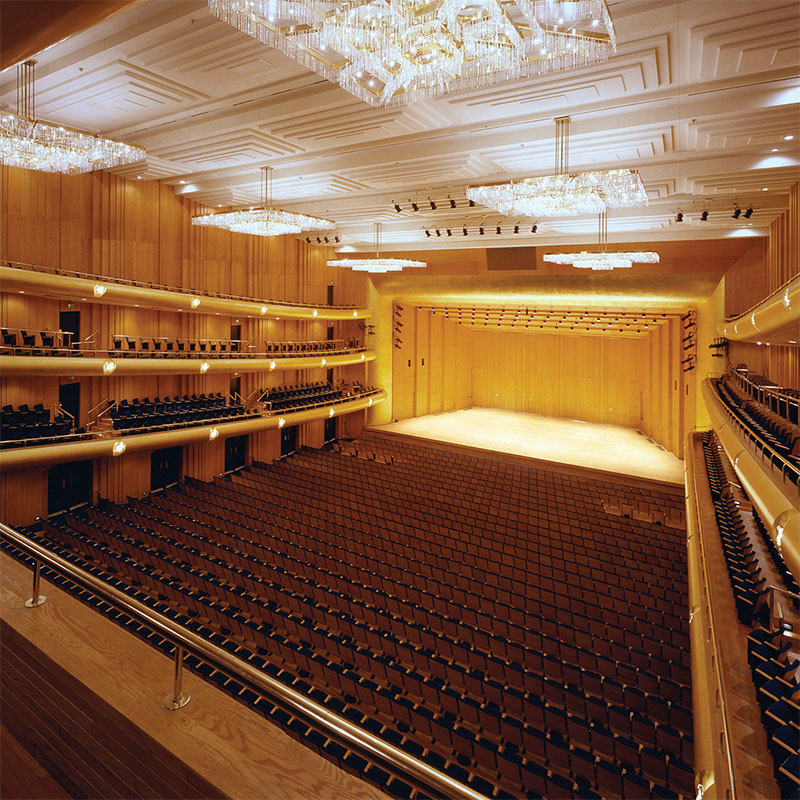 The view of Abravanel Hall from West Temple.Abravanel Hall’s design features unobstructed views, 16-foot crystal chandeliers and 24-karat gold leaf.