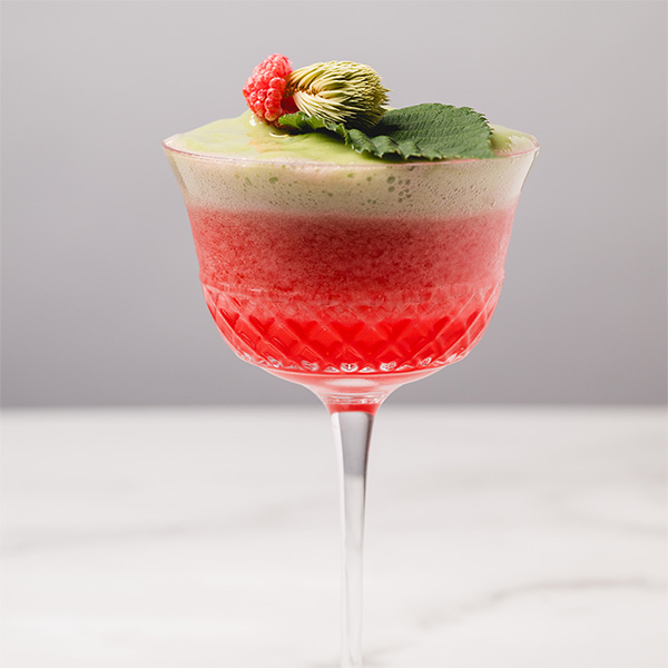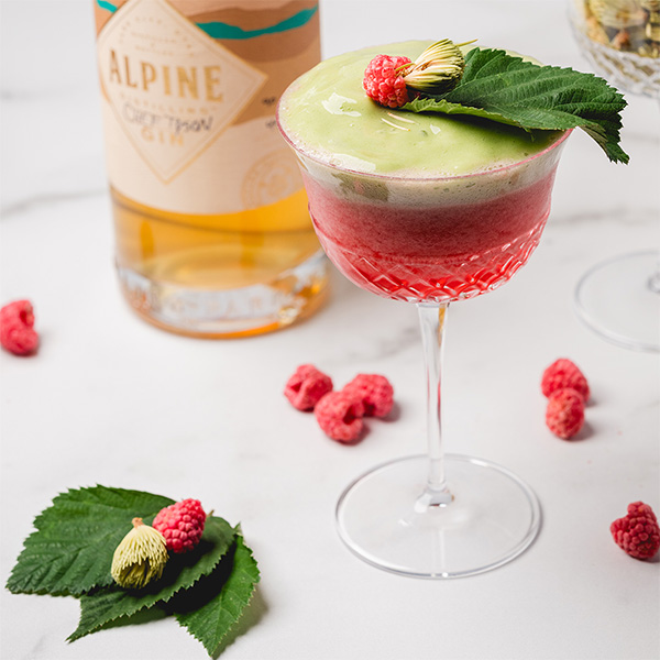 Shake with ice and strain into Nick & Nora. Top with chilled espuma. Place a large, clean raspberry leaf on top of the foam. Stuff a freeze-dried raspberry with a freeze-dried spruce tip and place on top of the raspberry leaf.