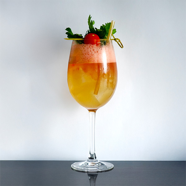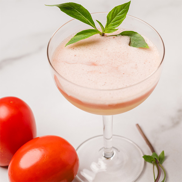 Combine ingredients in a shaker tin, shake, strain into a stemmed wine glass. Add ice, top with tomato soda.