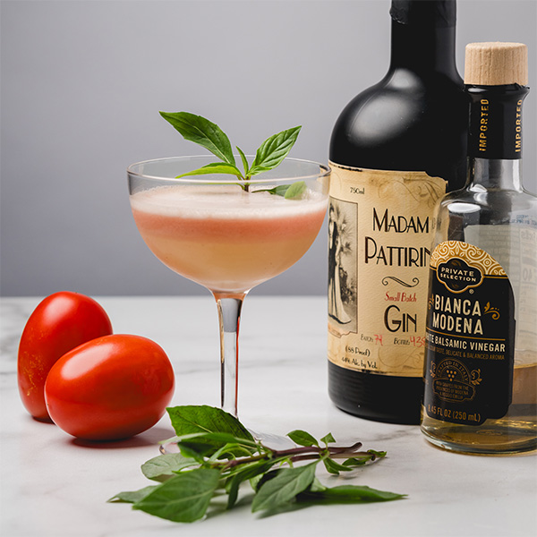 “Caprese is a really simple dish,” he says. “There are only three ingredients. Tomatoes are abundant in the summer and I’m utilizing multiple varieties to make a tomato water. For the mozzarella element, I’m using the whey liquid from our imported Italian burrata cheese. The whey adds an awesome creamy flavor and texture. White balsamic vinegar of Modena (Matteo’s family is from Modena) gives you the perfect amount of acidic balance. Lastly, local basil brings a sweet herbaceous note to play with the spices and botanicals in Madam Pattrini Gin from Ogden’s Own Distillery