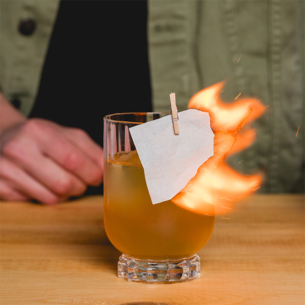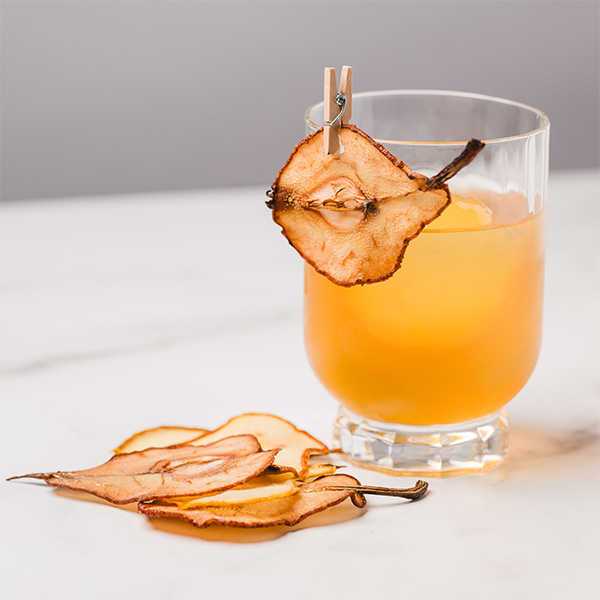 Serve in a rocks glass, garnished with a dried pear slice and a piece of flash paper