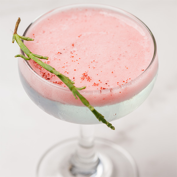 Shake and strain into a small coupe. Siphon sumac tea, watermelon juice, hibiscus liqueur and salt foam. Sprinkle salted sumac on one half of the cocktail and garnish with a pickled sea bean.