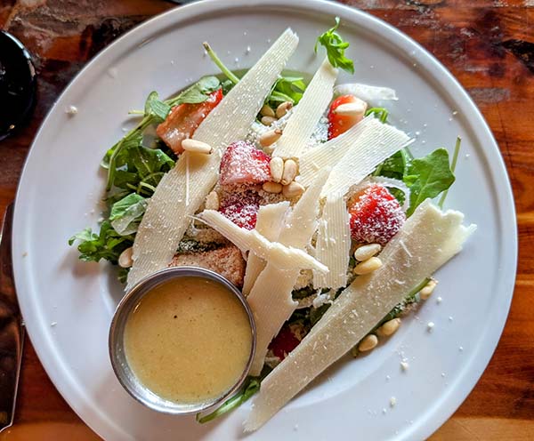 Balcony One’s menu has a solid lineup of Mediterranean-inspired dishes that show off fresh, local ingredients. One of my favorites was the bone-in bacon starter—a thick, glazed cut of pork belly with a sweet, caramelized crust. The glaze gives a nice sticky crunch while the inside is rich and tender. The jicama slaw served on the side is light and refreshing, balancing the dish with a bit of freshness and tang. Another good starter is the arugula salad. It’s simple and fresh, with a peppery kick from the greens and a tangy lemon vinaigrette, topped with shaved Parmesan.