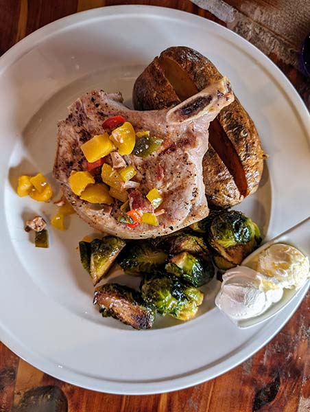 For the main course, I tried the pork chop, which was downright impressive. The chop itself is thick and juicy with a perfectly seared crust. It comes with roasted Brussels sprouts and a flash-fried baked potato, which gives the potato a crispy skin and a soft, fluffy interior. This isn’t just a pork chop—it’s one of those meals you’ll be thinking about long after you’ve left. Seriously, I will make this a regular stop when traveling to Zion any time in the future.