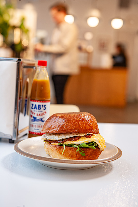 From the local brioche bun, high-quality butter, spiced honey sausage (that is made just for their shop), house aioli, and even a cured pork loin for the Canadian bacon sandwich building block is carefully selected. “Our sausage sandwich is our most popular,” says Macy. “We’re proud of that, too. We came up with a bunch of different ideas to develop our sausage recipe. We’re really happy with that landed. It’s sweet, it’s spicy. I think it’s a nice balance.”
