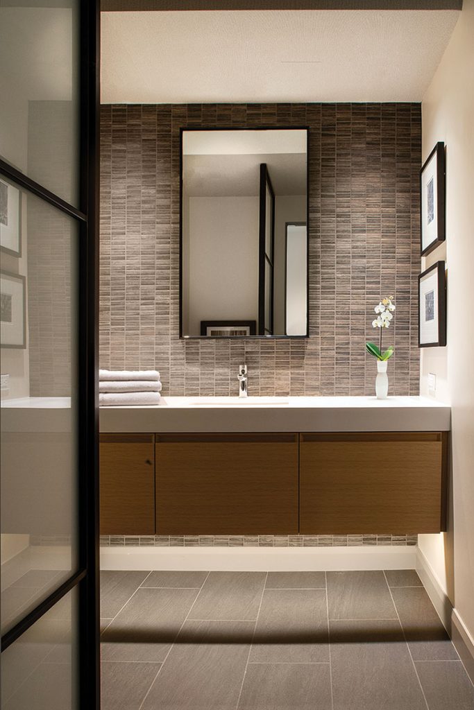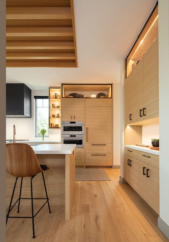 Echoes of the clients’ desert home appear throughout. In the kitchen, a wood-clad beam ceiling nods to the Ivins retreat. Straight-lined white oak warms the floors, beams and cabinetry—each subtly varied in tone to avoid uniformity. The palette contrasts near-white walls with dark elements: a Neolith fireplace, black hardware and charcoal stone-look tile.
