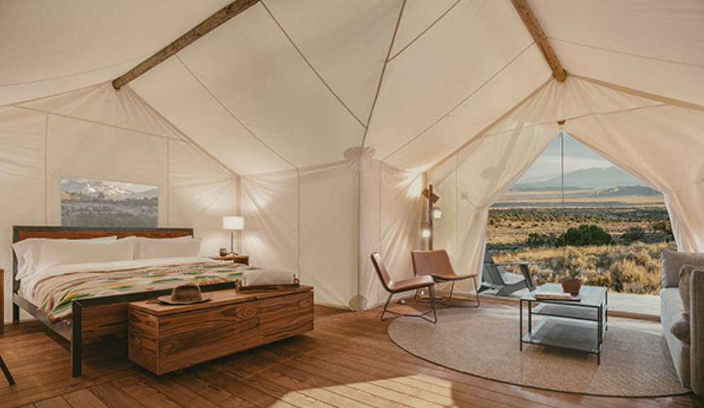 One of two locations given two Michelin keys in Utah, ULUM Moab is located about 25 minutes out of town. A Michelin key is similar to a Michelin star given to a restaurant but for lodging. Two Michelin keys denote an exceptional stay with premier service, stunning design, and a unique location. ULUM is all of those things and more. The resort takes upscale glamping to another level. With a stunning brick-and-mortar lobby, each full Safari tent is spread out from the other for maximum privacy and situated for the best views.