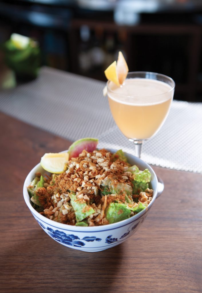 The bar’s aesthetic takes cues from mid-century designs and natural textures, incorporating Danielle’s Taiwanese heritage with speckled flooring and glass-block separators. A large curved bartop sets the tone for the room, and pops of deep evergreen make appearances throughout the space. “We wanted it to be really warm in here, but not overdone,” Danielle chimes in. As spring approaches, this writer is most excited about Neighbors’ sizable outdoor patio as an outpost for people watching and spritz sipping.