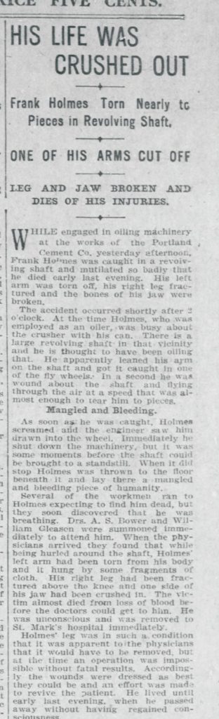 The Salt Lake Herald reports on reports on the factory incident involving Frank Homes on July 31, 1903. Clipping courtesy of Newspapers.com