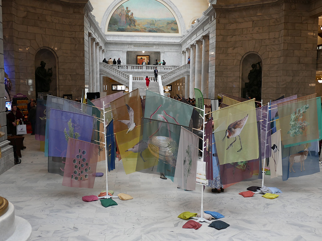 Most of the installations have already happened. Artist Nick Pederson’s May-June installment, “Here Today, Gone Tomorrow,” consisted of giant billboards displaying photorealistic depictions of two very different outcomes for the Great Salt Lake—one with abundant water and a thriving ecosystem, and another marked by toxic dust storms and aridification. Acclaimed interdisciplinary artist Mitsu Salmon presented a site-responsive dance performance at Miller Bird Refuge and Nature Park, blending dance, soundscape and visual storytelling. Taking place over four days, “Feathered Tides” guided audiences through the park as dancers embodied movements of Great Salt Lake shorebirds. Another visual artist, Kellie Bornhoft, consulted with the Great Salt Lake Institute and the Utah Division of Wildlife Resources to identify and illustrate 64 species that depend on the lake. Printed on sheer fabric banners, viewers flipped through the images of birds, insects, plants and more, observing how the transparent material interconnected them.