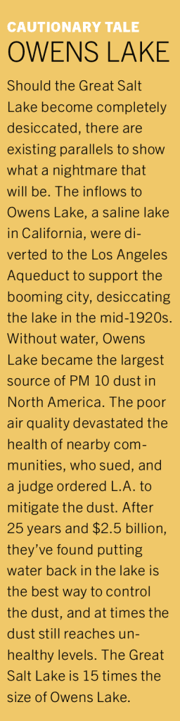 Not every idea has gotten traction. Notably, there was a proposal to create a 700-mile pipeline from the Pacific Ocean to the Great Salt Lake. “We need to start considering how long some of these projects would take,” says Vernon. “It could take decades for a project like that to get underway and the lake could be in pretty poor shape by then.”