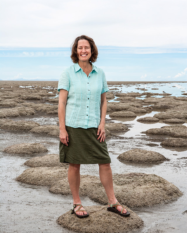 Dr. Bonnie Baxter collects specimen samples from the Great Salt Lake as she has for the last 25 years. One of her collection sites is at Spiral Jetty, a coil of basalt rock built by sculptor Robert Smithson in 1970. Early in her career, Baxter had to use a canoe to reach Spiral Jetty. Years later, she would slosh to Spiral Jetty in her waders. Now, she walks over dry lakebed crust. Spiral Jetty has not moved, but the shoreline of the Great Salt Lake has—about a mile away.