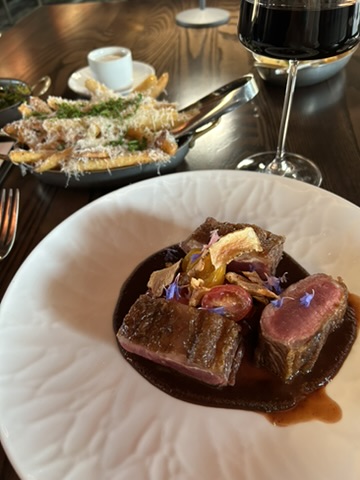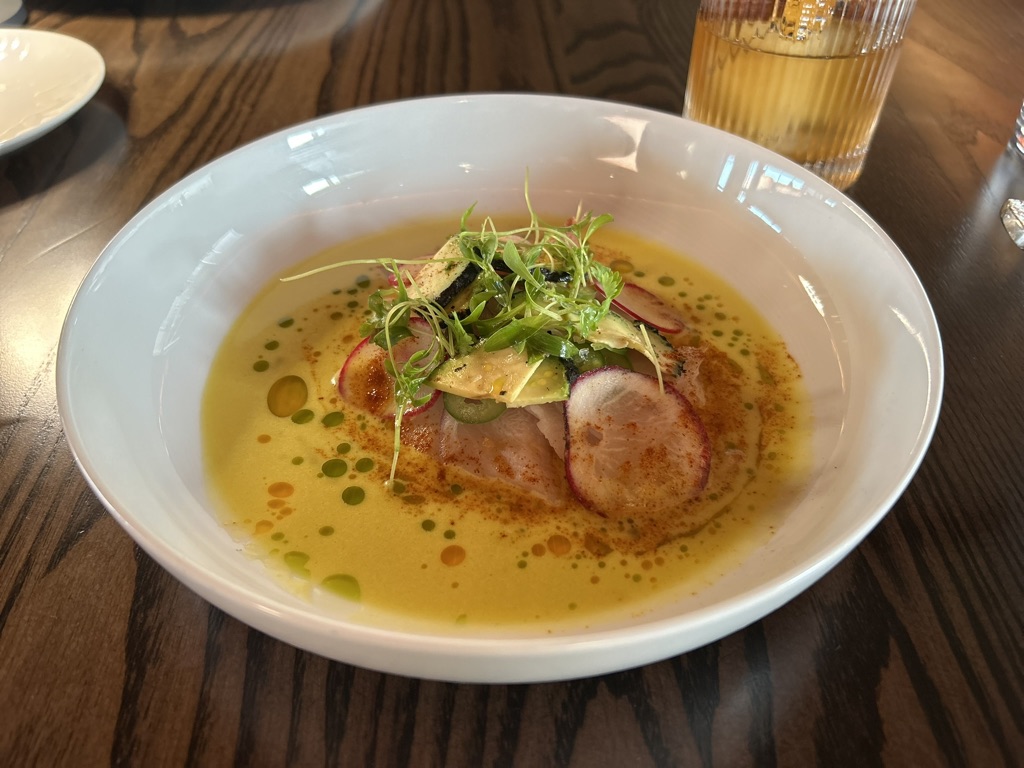 Admittedly, I arrived for my reservation at Basalt in a bad mood. Google maps took me on a frustrating 20-minute detour through the resort’s sprawling construction zones, following rutted dirt tracks that may some day become actual roads. After finally arriving at an unmarked group of buildings, a valet pointed to one which he assured me housed the restaurant. After finding an elevator to the top floor, I was promptly greeted and seated at a cozy banquette in the glass-walled dining room, and my mood improved dramatically after being served a nicely built High West Old Fashioned with a lovely twist of torched orange zest. The menu here is presented steakhouse style, with sharable starters and sides to accompany protein-focused mains and high-dollar steaks (I did not order the 16-ounce, 45-day-dry-aged Kansas City-sourced Wagyu coming in at $225; maybe next time). Some high points: The hamachi “ceviche” served crudo style had a nice balance with citrusy Peruvian tiradito sauce, avocado and bright radish. I love seeing lamb on a menu, and this one was expertly cooked and sauced with classic cherry demi-glace. It sounds like a humble dish, but the sweet-and-salty side of creamed corn (studded with cipollini onions and crispy lardons) was an unexpected hit. For dessert, the restrained and delicate olive oil and lemon salted crémeux was a delightfully zingy finish after a big meal. I even returned to my very dusty car with a smile on my face.