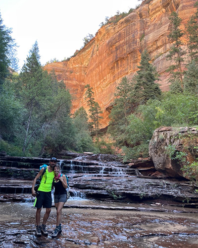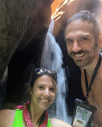 The waterfall gushes through an opening above our heads that looks to be about only 6 feet in diameter. We take in the sight for as long as we can stand the temperature of the water. Then we do what anyone would do after bushwhacking through a canyon for hours to reach this spot—we take a selfie.
