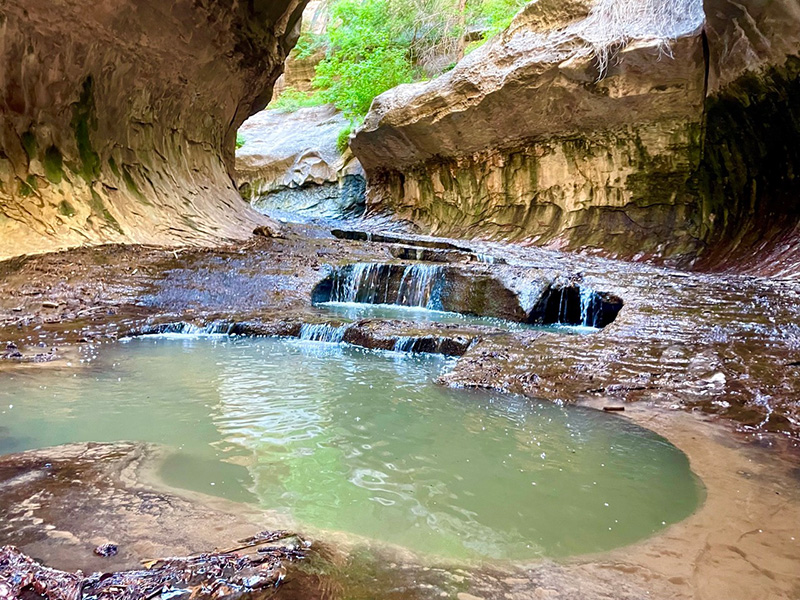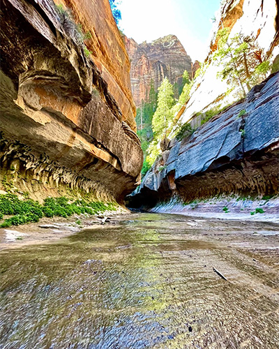 As we get closer to the Subway section, the rock formations become more startling and distinct. The water slides in sheets across the red rock, over time eroding it into a wide set of gentle staircases. Treading up those slick steps becomes the only way forward. We switch to lighter footwear because, from this point on, we’ll be hiking upstream in the creek, with water up to our ankles. After the second red-step waterfall, the walls of the canyon begin to curve in on themselves, almost forming a complete tunnel. The unique formation is what gives the Subway its name (but that didn’t stop me from confidently informing other people on the trail that it was named for famed explorer Alexander Subway).
