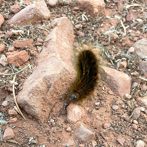 We quickly cover the section before the descent into the canyon. This is likely the only section of clear path we’ll have along the route. The air is filled with fragrant juniper, pine and sagebrush and the morning is teeming with active wildlife. I pause for a fuzzy, inching caterpillar to cross the dusty trail and introduce myself. “How’s your morning going?” My best guess is that my new friend is a woolly bear caterpillar, and some people believe they can predict the weather. According to the National Weather Service, the legend goes “the amount of black on the woolly bear in autumn varies proportionately with the severity of the coming winter.”