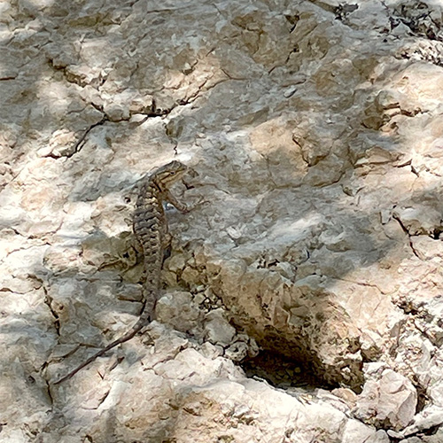 Around the halfway point, we start keeping our eyes peeled for dinosaur tracks. To go on we have only a loose description of the rocks that encase them: two large, flat gray boulders to the right of the creek (if headed downstream). I think I inspected every gray boulder for the better part of a mile and my partner still spots them first. We call to Max and Isa, so we can all get our pictures of what remains of ancient life. In one of the dilophosaurus tracks, a lizard is relaxing in the shade of its hollow. It can’t be bothered to scurry away when we approach…so we get a photo of it, too. “Maybe one day you’ll fill out those tracks,” I say encouragingly.