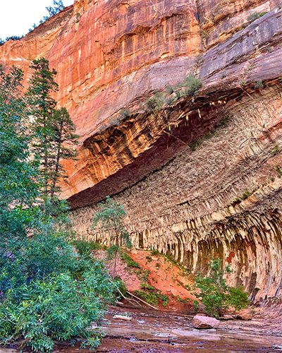 There is no groomed trail once we reach the floor of the canyon. We find our way up drainages, over boulders and across creekbeds. We do our best to keep dry so we don’t have to spend the whole day hiking in wet shoes (although at a certain point, getting our feet wet becomes inevitable). In addition to stopping for water breaks and to meet animal friends, occasionally I have to stop to just…take it in. Waterfalls pour over red rock, limestone and lava rocks, creating inviting but deceptively deep pools at their base, shaded by jade-green pine trees. Leafy plants grow in eaves over the surrounding cliff faces, creating natural hanging gardens where water trickles out from the rock.