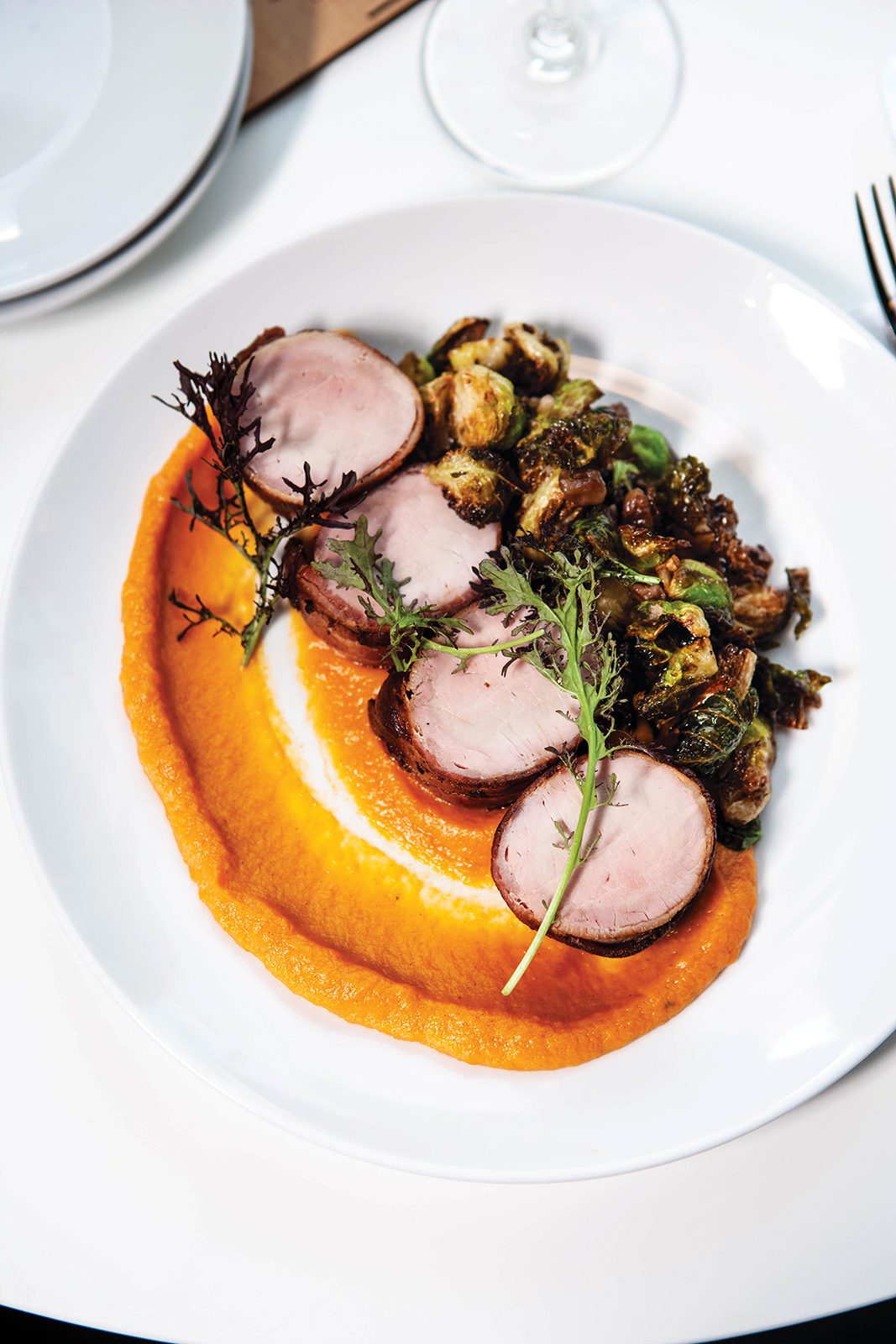 Finally, there is the back of the restaurant, which is reservation-only, along with private dining space. Again, the setting is beautiful and well thought out. Fresh flowers were on every table, along with crisp white linens. From there, you can order from the Salt & Olive menu and the coming soon Oak & Ash menu, which is more of a fine dining approach. My server couldn’t quite explain what “coming soon” meant. But the menu was a selection of “La Carne,” which ranged from a NY Strip, Porterhouse, and Filet to a half chicken or lamb. This menu changes seasonally but has the coming soon label at the bottom. So we had to double-check that we could actually order off of it.